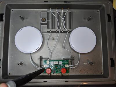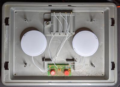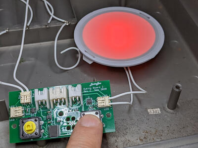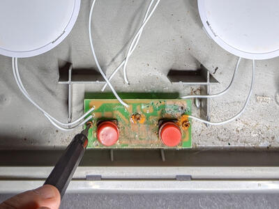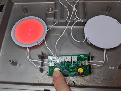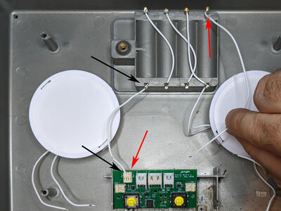 the connector grabs the wire. Test the burner by pushing the right-hand button and ensuring the burner's light turns on. If it does not, (1) try removing and reinserting the wires to ensure they are firmly seated. Push the small tab on the top of the connector to release the wire. (2) Try plugging the LED wires in the other way: burner's right to LED- and burner's left to LED+. It's possible that